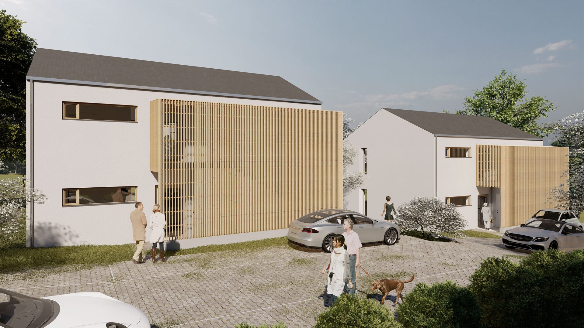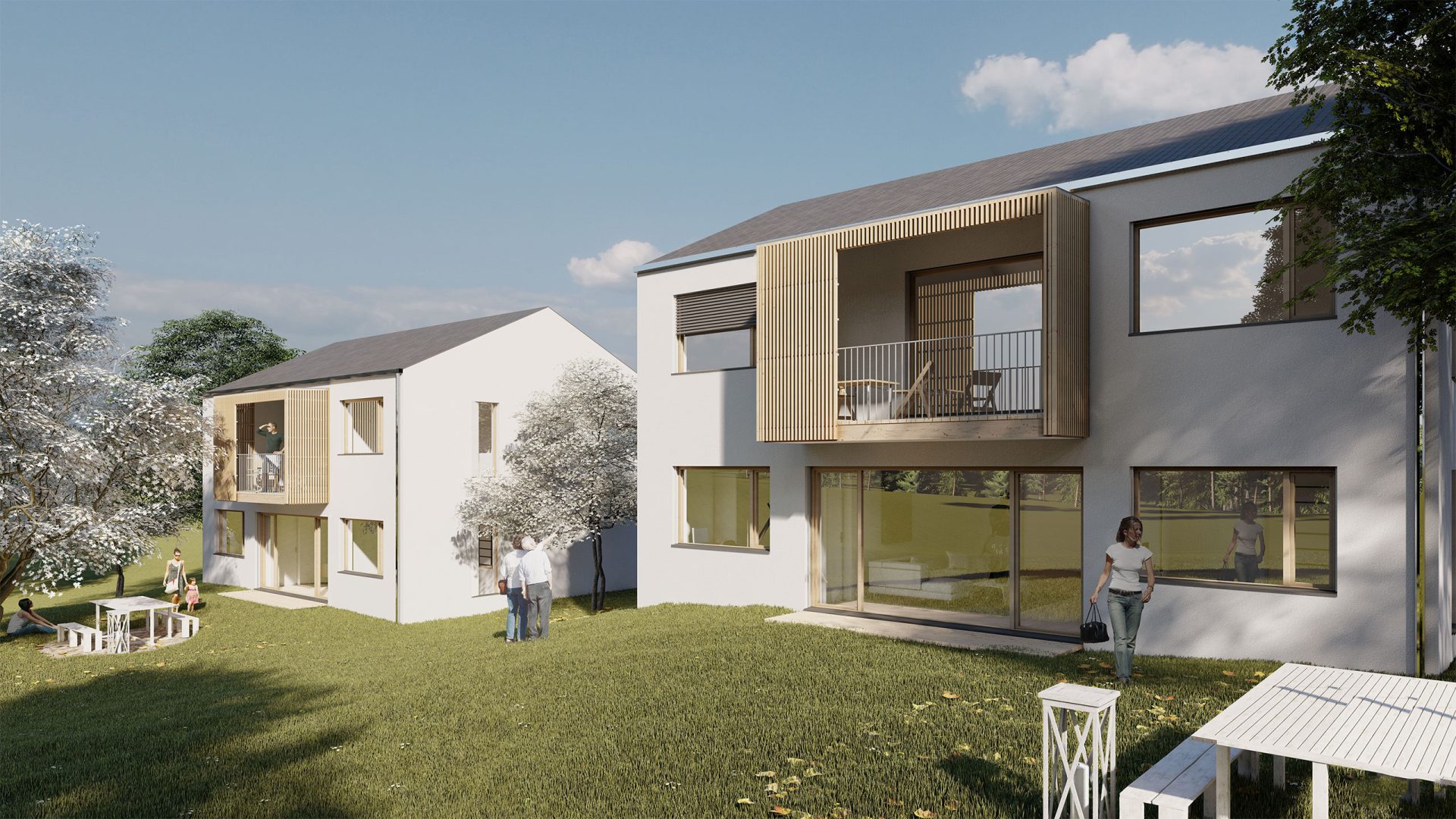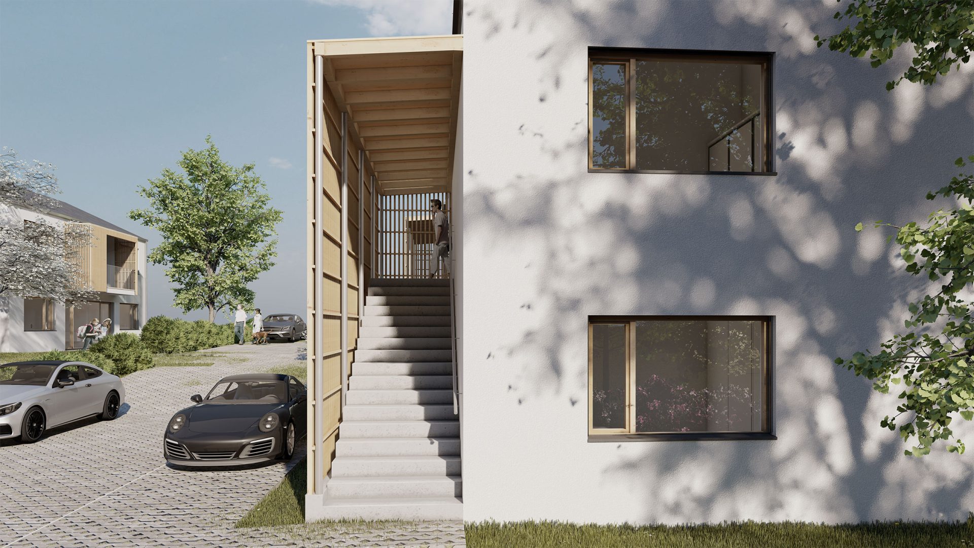 Das Ensemble aus vier identischen Wohngebäuden bildet ein klar strukturiertes Gefüge aus kompakten Baukörpern, die jeweils zwei Wohneinheiten beherbergen und durch ihre reduzierte, ruhige Formensprache geprägt sind. Ein prägendes Element ist das vorgesetzte Treppenhaus mit seiner fein strukturierten Holzverkleidung, dessen Motiv sich formal auf der gegenüberliegenden Seite in den auskragenden Balkonen fortsetzt.